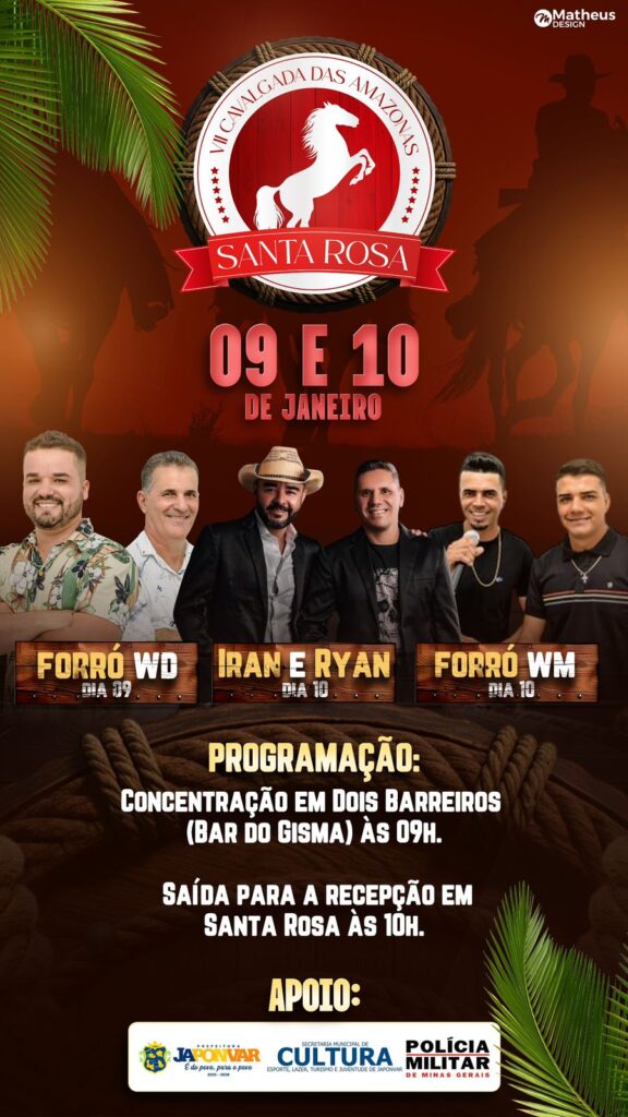 A comunidade de Santa Rosa será palco da VI Cavalgada das Amazonas, que acontece nos dias 09 e 10 de janeiro, reunindo tradição, cultura e muita animação. O evento contará com grandes atrações musicais: Forró WD, Iran e Ryan e Forró WM, prometendo movimentar a região.