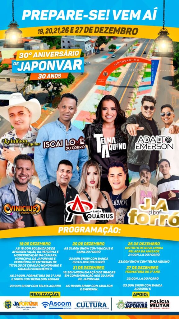 Além da programação musical, o evento conta com o apoio da Câmara Municipal de Japonvar, Polícia Militar e diversos parceiros locais, reforçando o compromisso da administração municipal em promover cultura, lazer e entretenimento para toda a população.